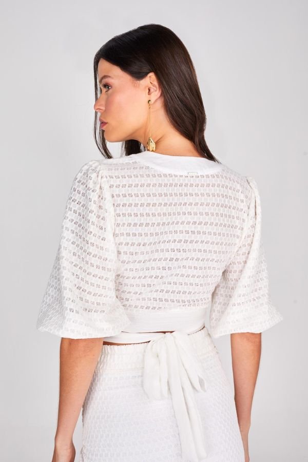 Blusa Confeccionada Em Tecido Rendado, Modelo Transpassado Com Amarração Na Cintura.