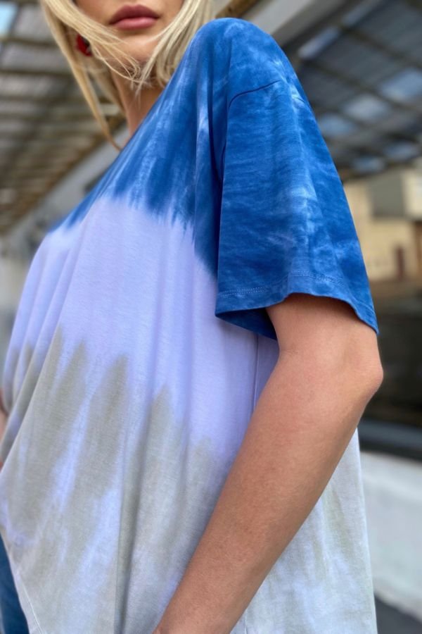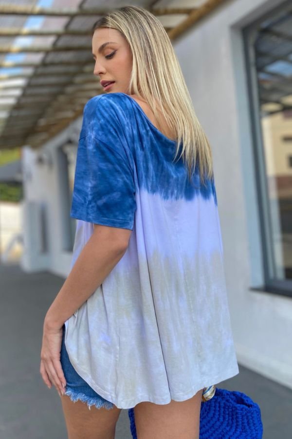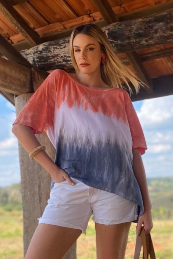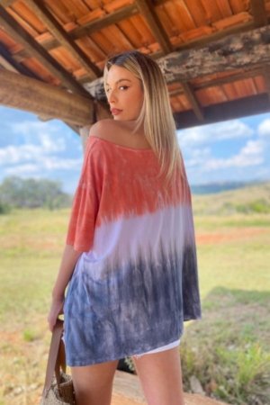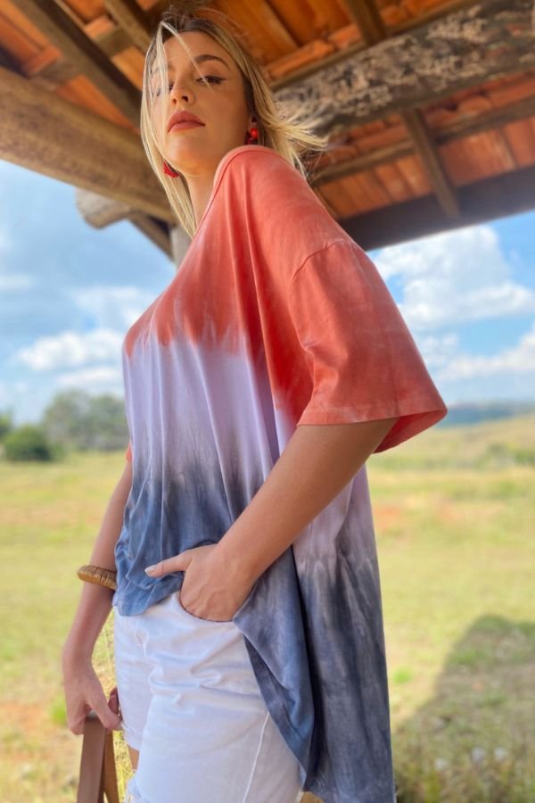 BLUSA CONFECCIONADA EM MALHA DE VISCOSE, MODELAGEM AMPLA E ESTAMPA TIE DYE.