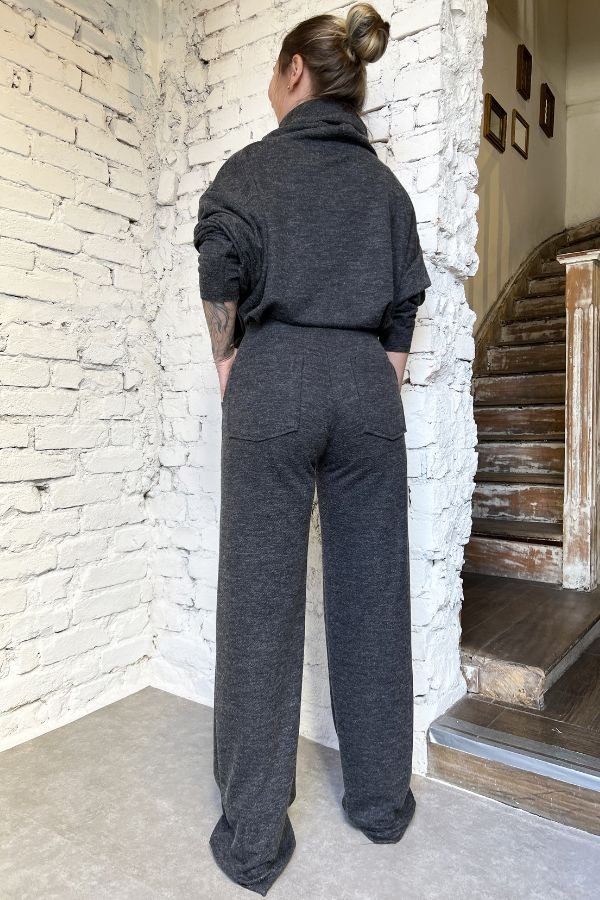 Calça Confeccionada Em Malha De Tricot Com Toque Soft, Modelo Pantalona, Aplicação De Elástico Na Cintura, Bolsos Laterais E Traseiro.