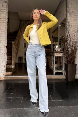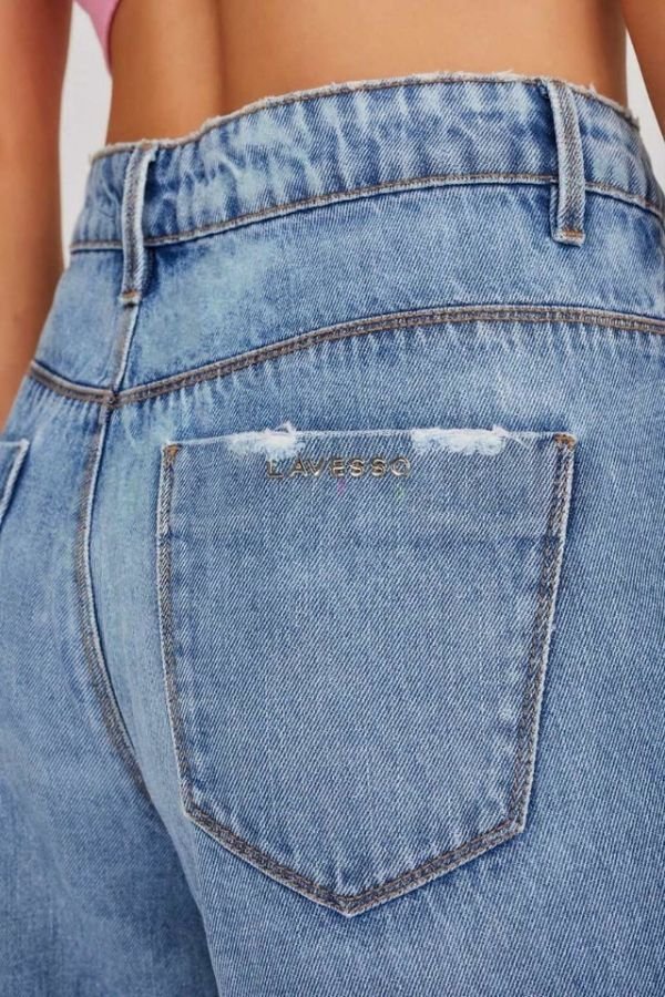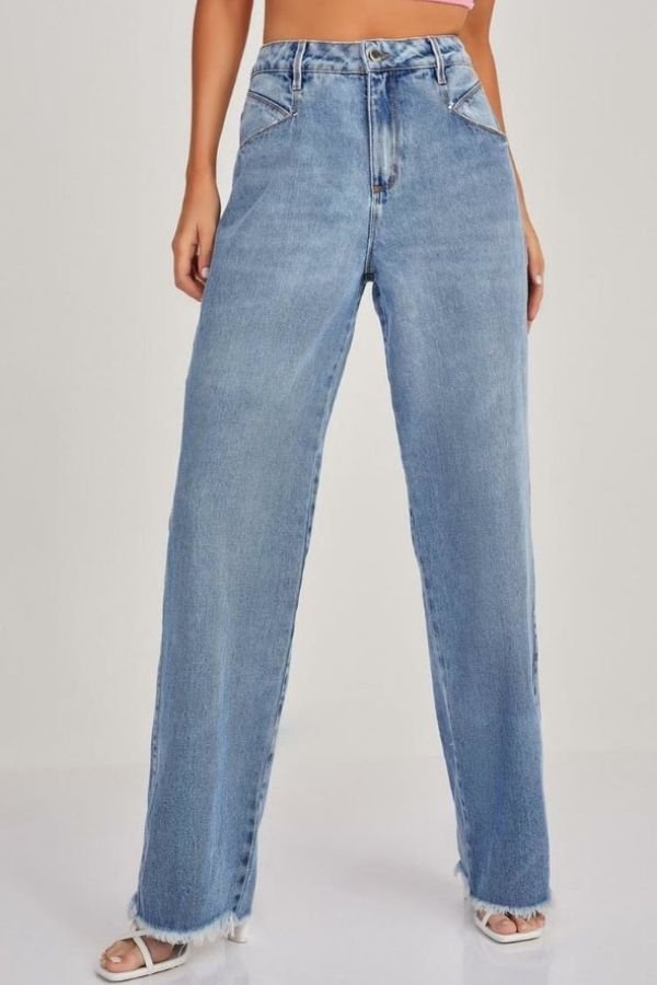 Calça Modelo Wide Leg, Confeccionada Em Jeans Sem Elastano, Detalhe No Bolso E Fechamento Dianteiro Por Zíper E Botão.