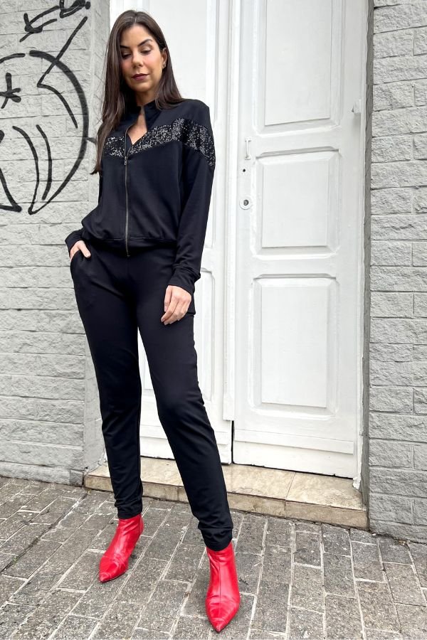 Confeccionado Em Malha De Moletinho, Blusa Com Aplicação De Paetês, Bolsos Laterais, Fechamento Dianteiro Por Zíper, Cakla Com Aplicação De Elástico No Cós E Bolsos.