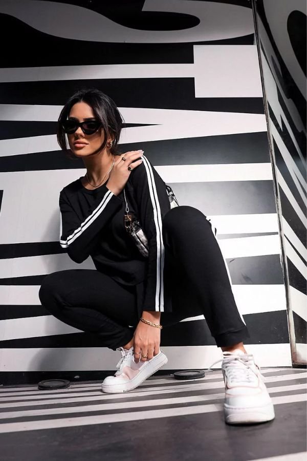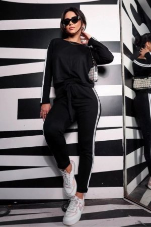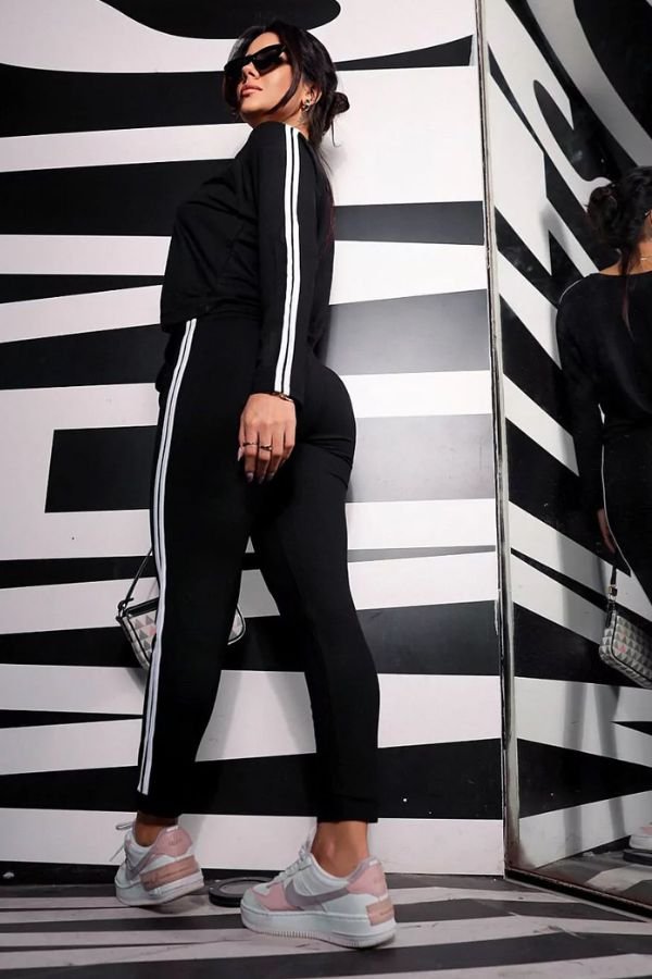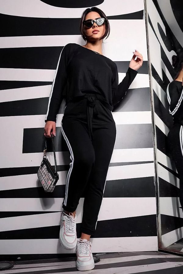 Conjunto Confeccionado Em Malha Moletinho, Blusa Com Shape Quadrado, Decote Canoa, Calça Sequinha Com Aplicação De Elástico No Cós, Detalhe De Amarração, Bolsos Laterais E Aplicação De Faixas Nas Laterais.