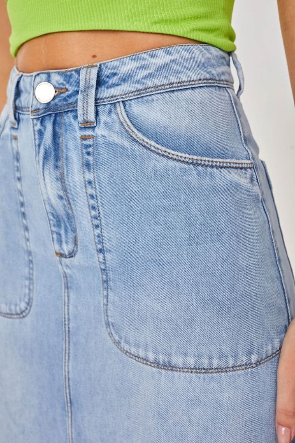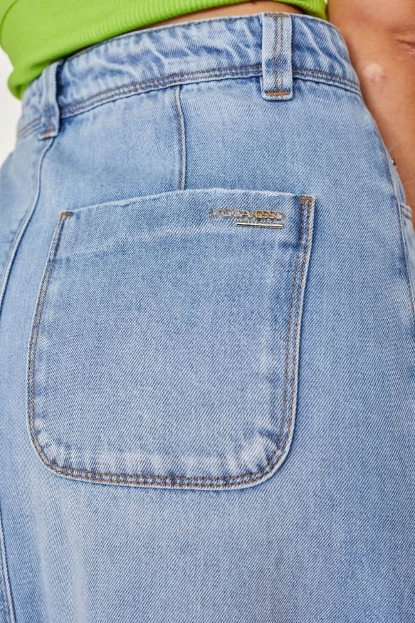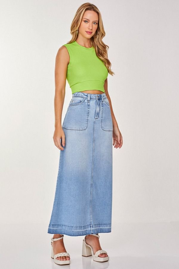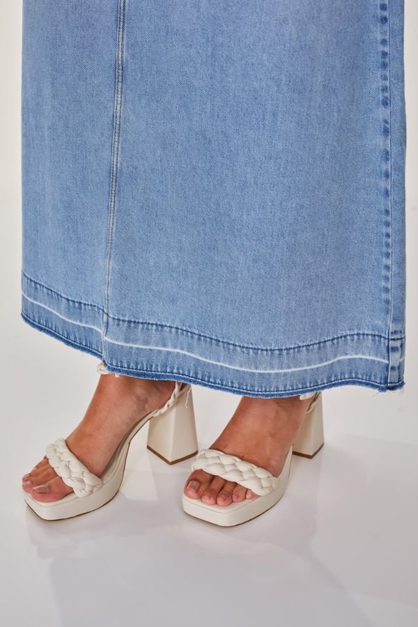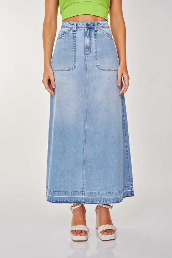 Saia Longa Confeccionada Em Jeans, Modelo Evasê, Acabamento Desfiado Na Barra, Bolsos E Fechamento Dianteiro Por Zíper E Botão.