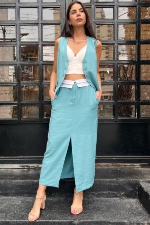 Saia Midi Confeccionada Em Viscose Sarjada, Pala Dobrada Com Detalhe Em Viés, Fenda Dianteira, Bolsos E Fechamento Dianteiro Por Zíper E Botão. Possui Forro.
