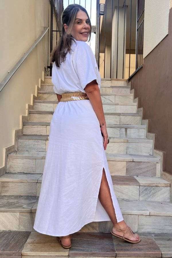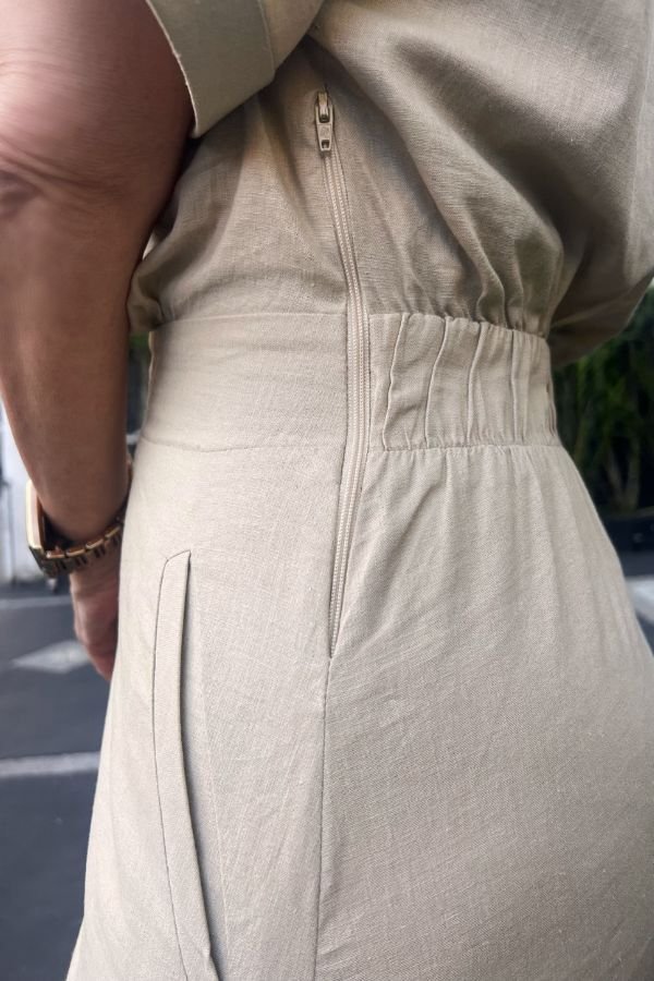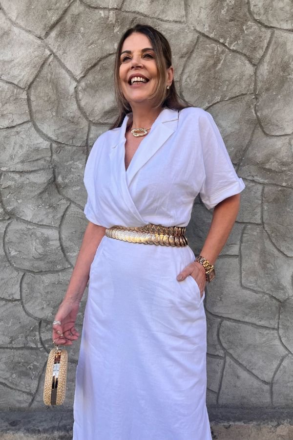Vestido Midi Em Linho, Manga Morcego Curta, Gola Blazer Transpassada, Recorte Franzido No Cós Frente E Elástico Costas. Saia Com Fenda Na Lateral E Bolso Na Frente. Possui Forro.