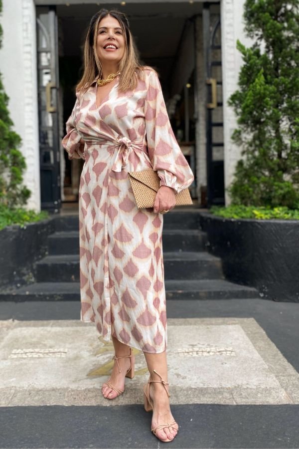 Vestido Midi Confeccionado Em Viscose Mista, Modelo Transpassado, Gola Polo, Mangas Longas Com Aplicação De Elástico Nos Punhos E Estampa Exclusiva Da Marca.